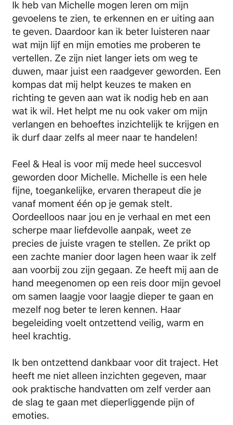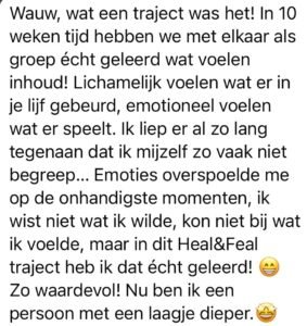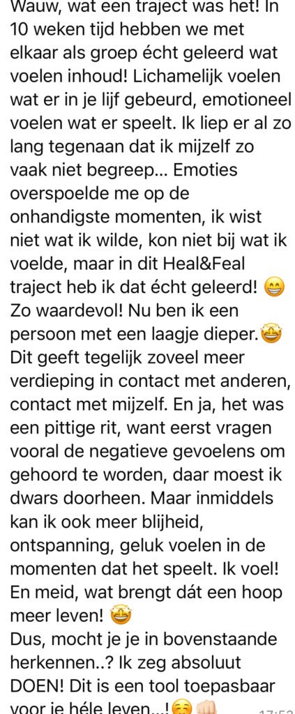 In Feel & Heal leer je niet alleen expert te zijn van je lijf, maar ook van je emoties. Je ontdekt dat je zelfs je diepste angst aankunt — en bouwt zo een stevige basis. Door diep af te stemmen op je lichaam en emoties richt je je leven opnieuw in, een leven vanuit vertrouwen, die echt bij je past!