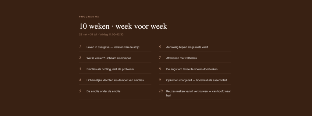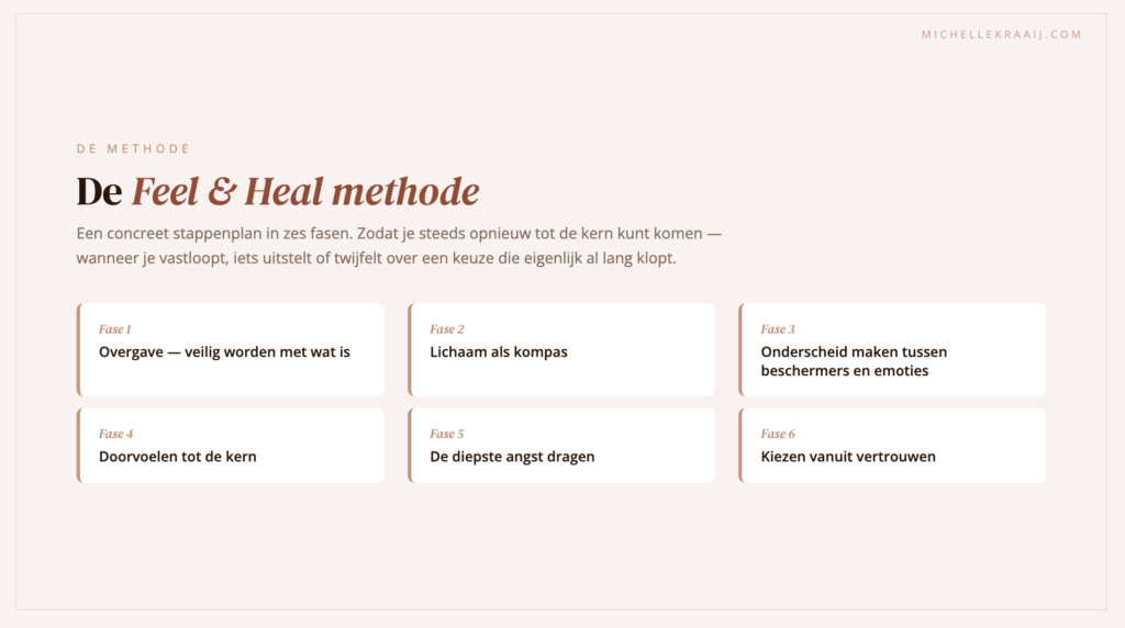 In Feel & Heal leer je die gevoelens niet alleen toelaten, maar serieus nemen als richtingaanwijzers. Ze laten zien waar je jezelf nog inhoudt en waar je eigenlijk iets anders wilt dan je nu doet.