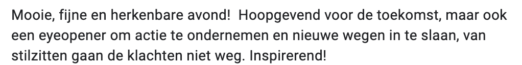 De openhartigheid waarmee ze haar verhaal doet en haar deskundigheid en zorgvuldige aandacht voor elke vraag, zorgen voor een sfeer waarin de aanwezigen met chronische klachten ook hun verhaal durven doen.