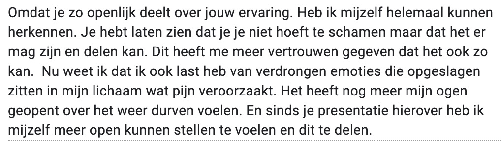 Door open te spreken over haar ervaringen en deze te koppelen aan theorieën, heeft zij ons geleerd dat het wegstoppen van emoties kan leiden tot langdurige lichamelijke klachten, blessures en mentale klachten zoals een burn-out.
